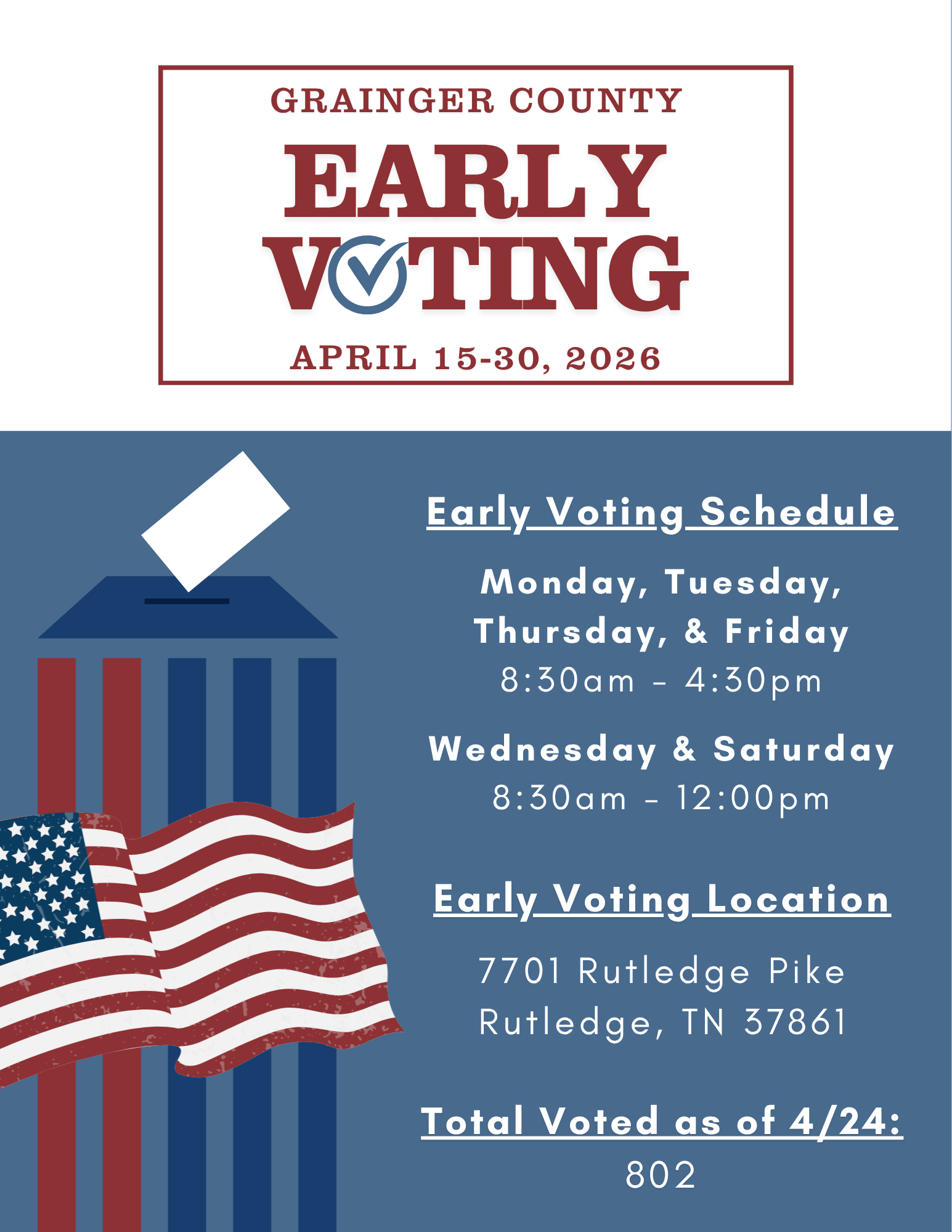 It is my honor to serve as your Administrator of Elections. My office takes pride in serving the citizens of Grainger County, Tennessee. I want to encourage all citizens to become active and involved in the voting process. In addition to being an active voter, I encourage you to get involved as a Poll Worker during our elections. We could not be successful without them! Finally, please always vote with confidence and know that my team is here to serve YOU!